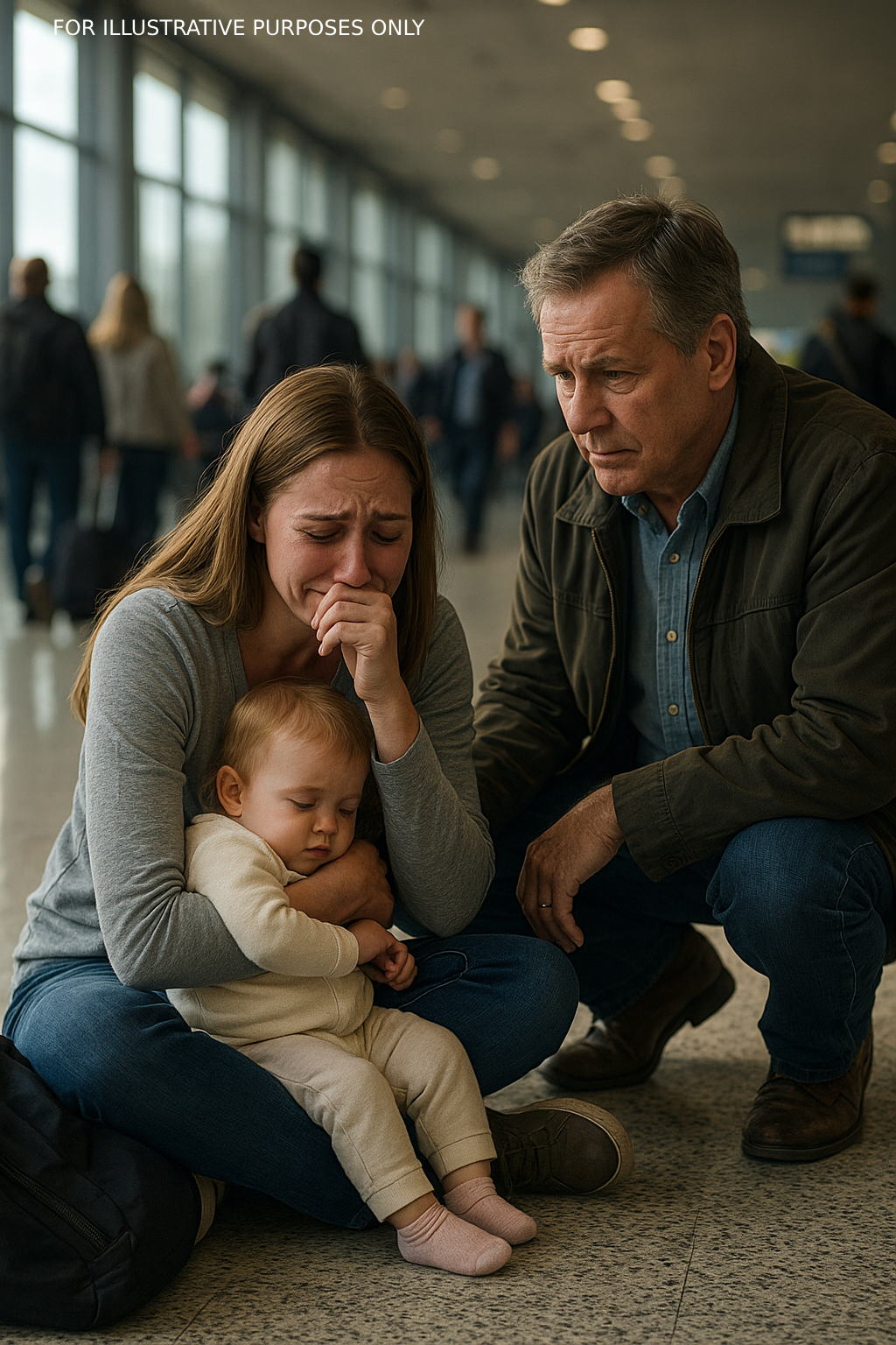 Megan, a 28-year-old single mother, sat on the cold linoleum clutching her two-year-old daughter, Ellie. Tears streamed down her face as she rocked the child gently in her arms, whispering soothing words she could barely hear herself over the noise of boarding calls. Her backpack lay open beside her, revealing diapers, formula, a tattered stuffed bunny, and a folder of hospital documents.