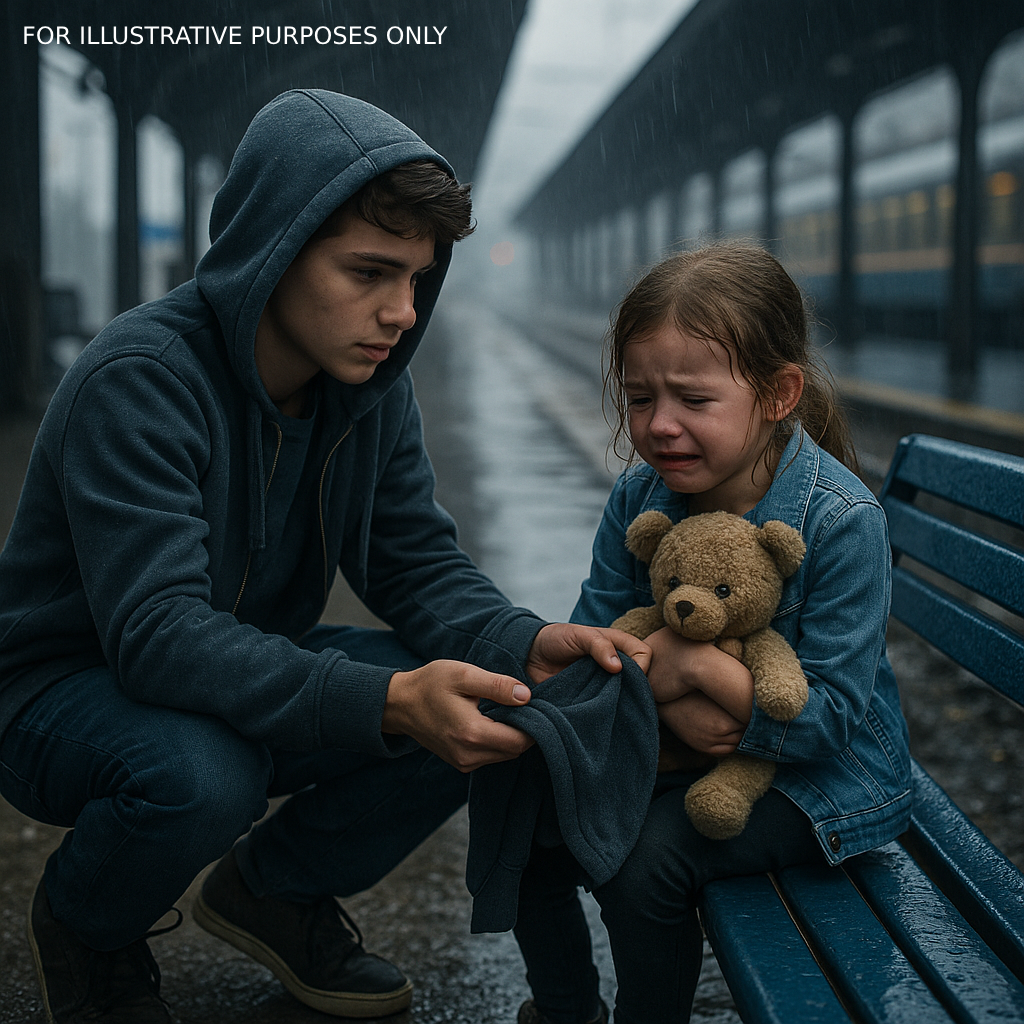 A little girl — maybe five years old — sitting alone on a bench, soaked and crying softly, clutching a worn teddy bear.